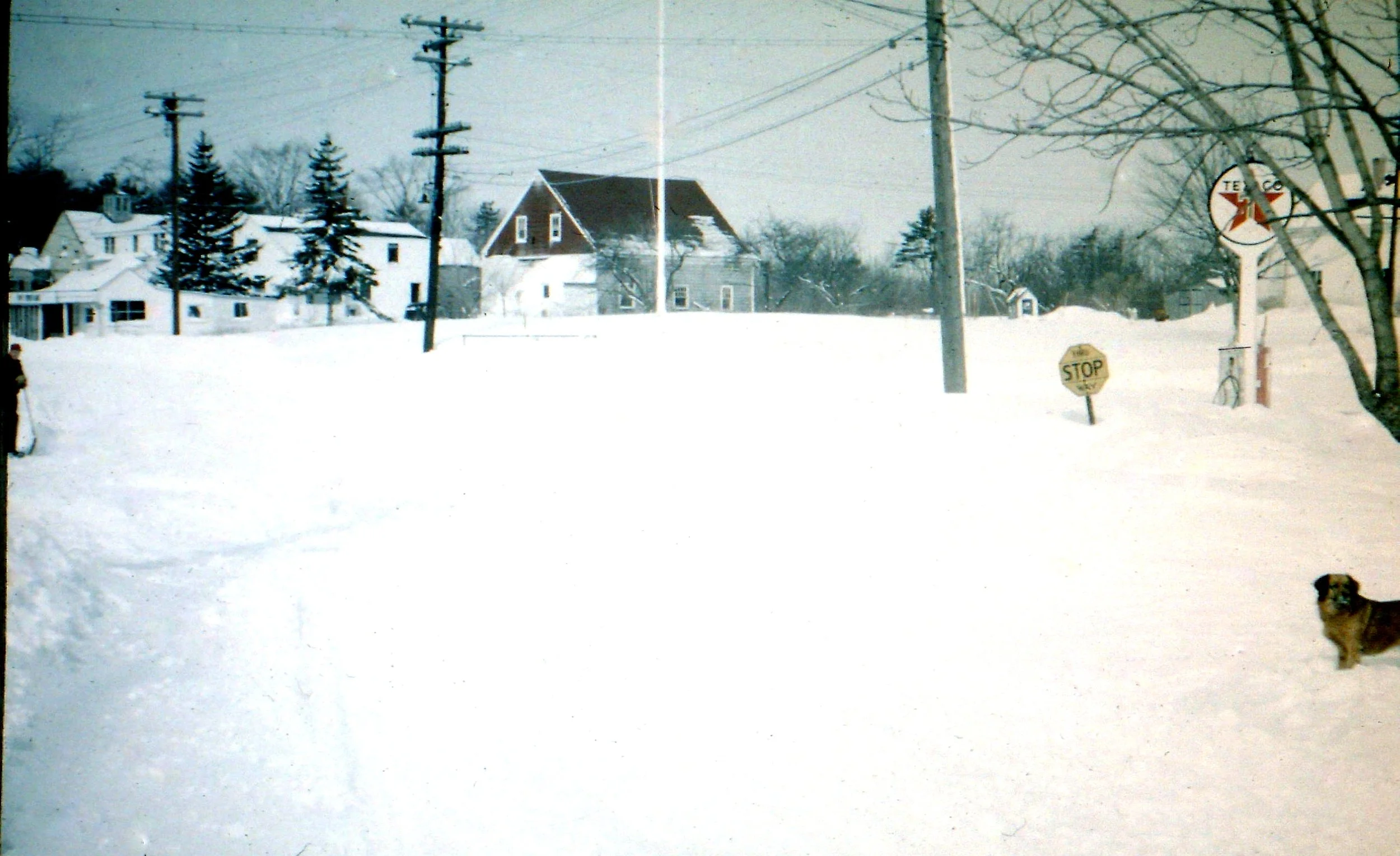 Warren Roberts (& Tom Bradbury's dog, Goldie) in Cape Porpoise square, March 17, 1956